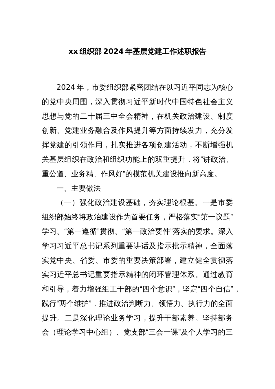 xx组织部2024年基层党建工作述职报告2024年,市委组织部紧密团结在以习近平同志为核心的党中央周围,深入贯彻习近平新时代中国特色社会主义...