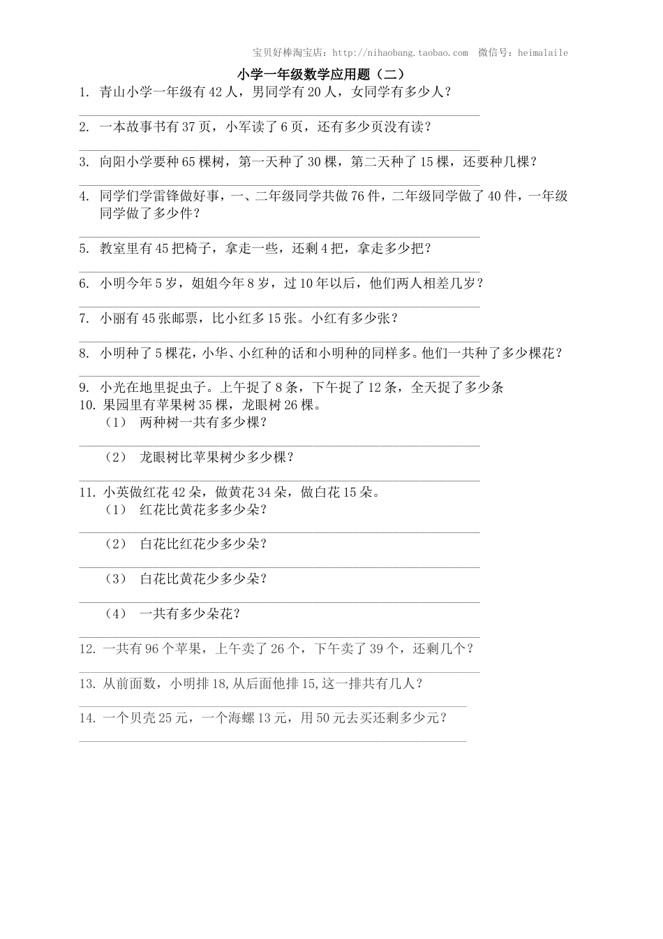 宝贝好棒淘宝店:http://nihaobang.taobao.com微信号:heimalaile小学一年级数学应用题(一)1、从花上飞走了6只蝴蝶,又飞走了5只,两次飞...