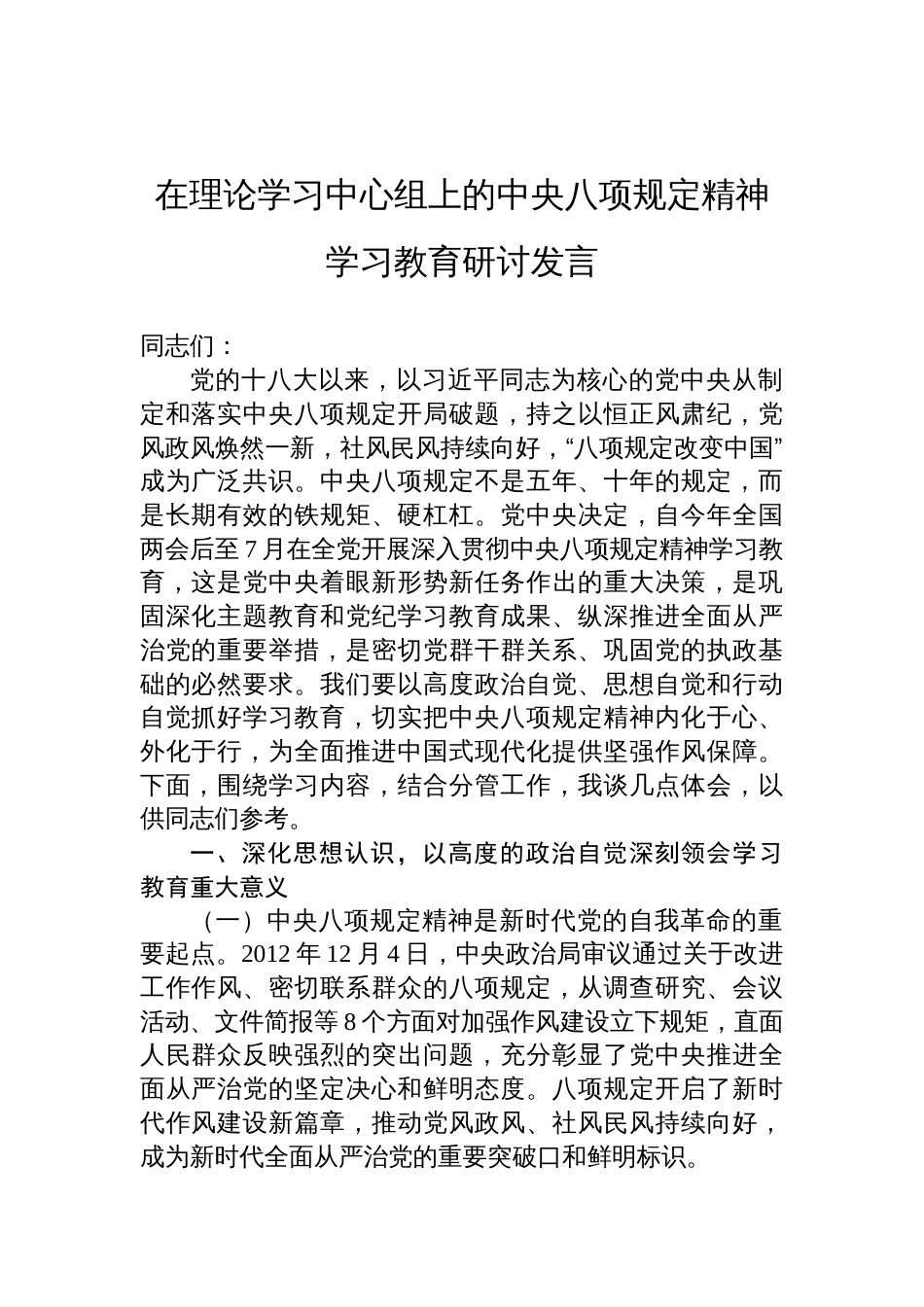 在理论学习中心组上的中央八项规定精神学习教育研讨发言材料_第1页