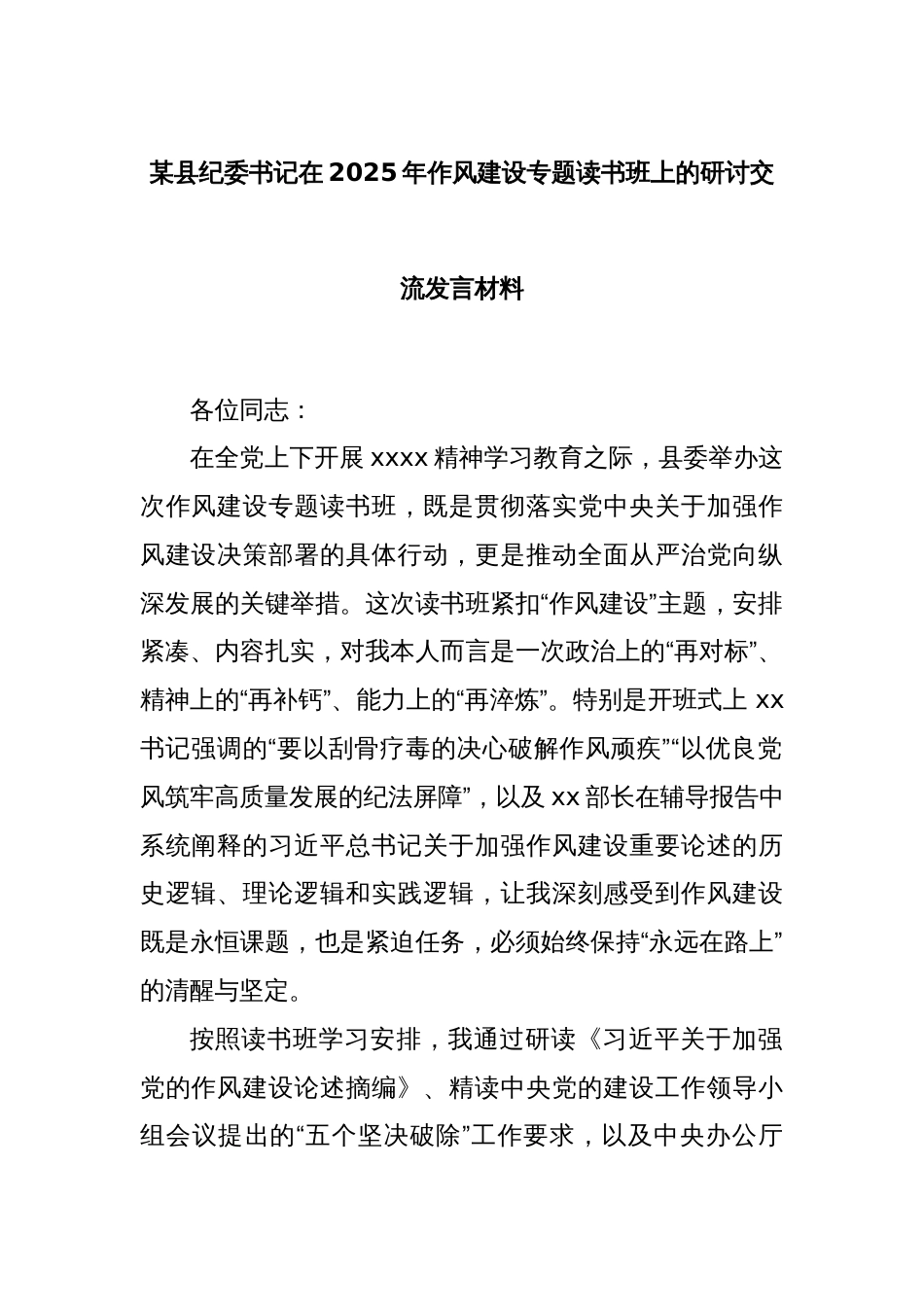 某县纪委书记在2025年作风建设专题读书班上的研讨交流发言材料各位同志:在全党上下开展xxxx精神学习教育之际,县委举办这次作风建设专题读...