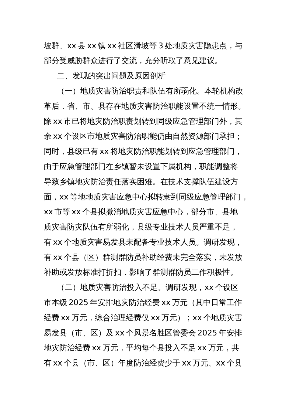 地质灾害防治工作调研情况报告根据工作安排,xx调研组开展了“地质灾害防治工作”领题调研活动,现就调研相关情况报告情况。一、调研选题情...