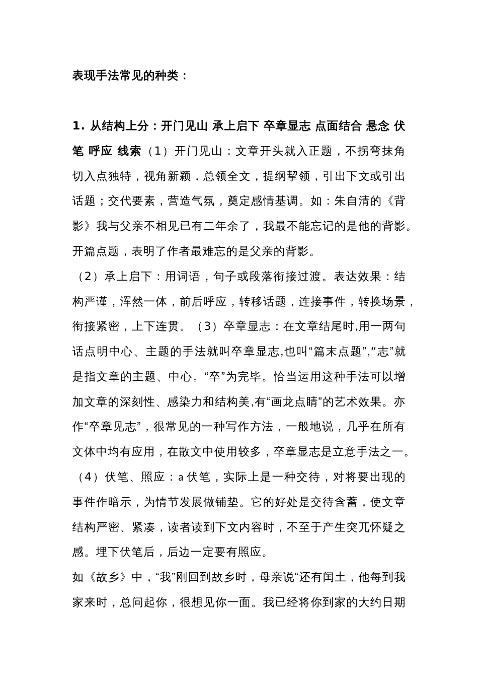 表现手法常见的种类:1.从结构上分:开门见山承上启下卒章显志点面结合悬念伏笔呼应线索(1)开门见山:文章开头就入正题,不拐弯抹角切入...